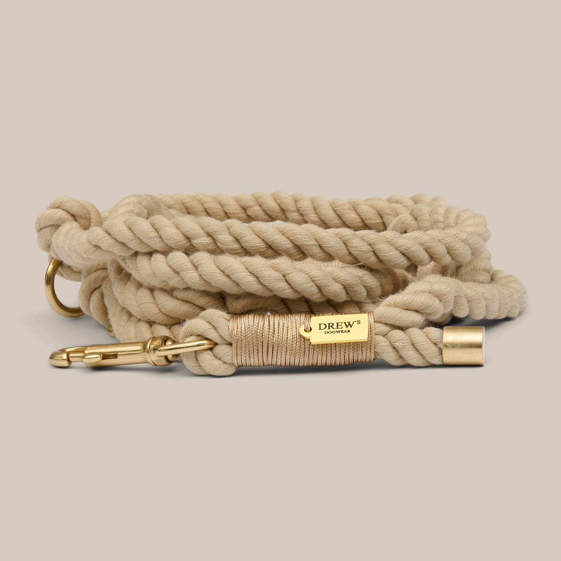 Hundesnoren i en smuk beige farve kan nemt bruges over skulderen, om taljen eller i hånden som en klassisk hunde snor.